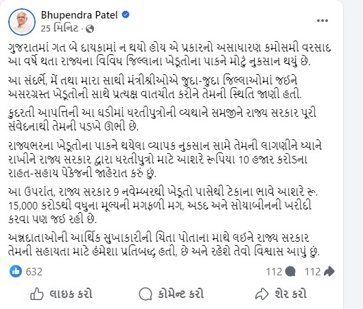 ગુજરાતમાં કમોસમી વરસાદ અને કુદરતી આફતોને કારણે પાકને થયેલા ભારે નુકસાન બાદ સરકારે ખેડૂતોને રાહત આપવામાં આવી છે. મુખ્યમંત્રી ભૂપેન્દ્ર પટેલે આજે સાંજે અતિ મહત્ત્વપૂર્ણ બેઠક બોલાવી હતી. જેમાં કૃષિ, મહેસૂલ અને નાણાં વિભાગના ઉચ્ચ અધિકારીઓ સાથે કૃષિમંત્રી અને નાણામંત્રી સાથે ચર્ચા કરી હતી. ત્યારબાદ CM ભૂપેન્દ્ર પટેલે એક્સ પર પોસ્ટ કરી માહિતી આપીને પાક નુકસાની માટે 10 હજાર કરોડની રાજ્ય સરકારની જાહેરાત કરી છે.