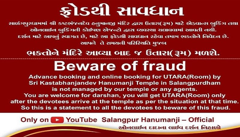 સાળંગપુર શ્રી કષ્ટભંજનદેવ હનુમાનજી મંદિર દ્વારા નકલી વેબસાઈને લઈને ભક્તોને સાવધાન રહેવા અપીલ કરી છે. સાળંગપુર ધામમાં શ્રી કષ્ટભંજનદેવ હનુમાનજી મંદિર દ્વારા ઉતારા (રૂમ) માટે એડવાન્સ બુકિંગ તથા ઓનલાઈન બુકિંગની કોઈપણ એજન્ટો દ્વારા વ્યવસ્થા કરવામાં આવી નથી. ભક્તો દર્શન માટે આવે ત્યારે રૂબરૂમાં જ રહેવા રૂમ ફાળવવામાં આવે છે. માટે આ ફ્રોડથી સાવધાન રહેવા તમામ ભક્તોને આપીલ છે.