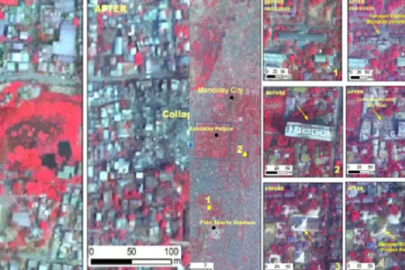 "તસવીરો દર્શાવે છે કે મંડલે શહેરમાં માળખાગત સુવિધાઓને વ્યાપક નુકસાન થયું છે, જેમાં 'સ્કાય વિલા', ફયાની પેગોડા (મંદિર), મહામુનિ પેગોડા અને આનંદ પેગોડા, મંડલે યુનિવર્સિટી અને અન્ય ઘણા મુખ્ય સ્થળોને સંપૂર્ણપણે અથવા આંશિક રીતે નુકસાન થયું છે," ઇસરો દ્વારા એક નિવેદનમાં જણાવાયું છે. સાગાઈંગ શહેરમાં, મા શી ખાના પેગોડા તેમજ અનેક મઠો અને અન્ય ઇમારતોને નુકસાન થયું હતું.