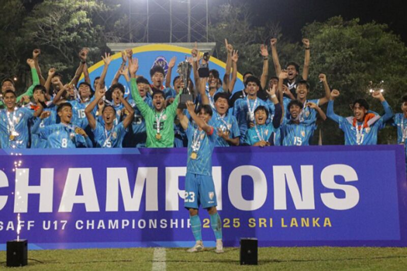 ભારતે ગઈકાલે કોલંબોમાં રમાયેલી પેનલ્ટી શૂટઆઉટ મેચમાં બાંગ્લાદેશને 4-1થી હરાવીને સાતમી વખત SAFF-U-17 ફૂટબોલ સ્પર્ધા જીતી લીધી છે.