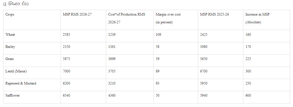 માર્કેટિંગ સિઝન 2026 27   રવિ પાક માટે લઘુત્તમ ટેકાના ભાવને કેન્દ્ર સરકારની મંજૂરી