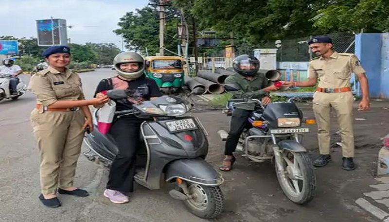 રાજકોટમાં બીજા દિવસે પોલીસની ડ્રાઈવ, પોલીસે હેલ્મેટધારી ચાલકોને ગુલાબના ફુલ આપ્યાં