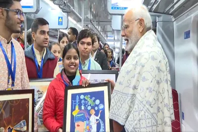 નવી દિલ્હીઃ પ્રધાનમંત્રી નરેન્દ્ર મોદીએ સાહિબાબાદ આરઆરટીએસ સ્ટેશનથી ન્યૂ અશોક નગર આરઆરટીએસ સ્ટેશન સુધી નમો ભારત ટ્રેનમાં સવારી કરી હતી. તેમની યાત્રા દરમિયાન તેમણે યુવાન મિત્રો સાથે ઉષ્માસભર વાતચીત કરી હતી, જેમણે તેમને પેઇન્ટિંગ્સ અને આર્ટ વર્ક્સની ભેટ આપી હતી.