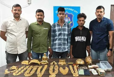 અમદાવાદઃ દક્ષિણ ગુજરાતના સુરતમાં માતાજીના અંદિર અને જૈન દેરાસરમાં ચોરીના બનાવનો પોલીસે પર્દાફાશ કરીને ટોળકીના બે શખ્શોને ઝડપી લીધા હતા. ચોરીમાં અન્ય બે આરોપીઓના નામ ખુલતા પોલીસે તેમને ઝડપી લેવા માટે કવાયત શરૂ કરી છે. તસ્કરોએ બંને ધાર્મિક સ્થળો ઉપરથી ભગવાનના સોનાના આભૂષણો અને મૂર્તિઓની ચોરી કરી હતી. પોલીસે તેમની પાસેથી લાખોનો મુદ્દામાલ જપ્ત કર્યો હતો. આરોપીઓની તપાસમાં ચોકાવનારા ખુલાસા થવાની શકયતાઓ વ્યક્ત થઈ રહી છે.