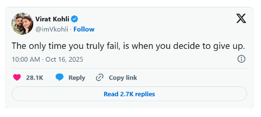 નવી દિલ્હીઃ ભારતીય ક્રિકેટ ટીમના સ્ટાર બેસ્ટમેન વિરાટ કોહલીએ ઓસ્ટ્રેલિયા સામેની વન-ડે સીરિઝ પહેલા સોશિયલ મીડિયા પર એક રહસ્યમય પોસ્ટ કરીને પ્રશંસકોને ચોંકાવી દીધા છે. ટેસ્ટ અને ટી20 ક્રિકેટમાં પહેલાથી સન્યાસ લેનાર કોહલીની આ પોસ્ટ તેમના આંતરરાષ્ટ્રીય ભવિષ્યને લઈને નવા-નવા કયાસો કાઢવામાં આવી રહ્યાં છે. વિરાટ કોહલીએ એક્સ ઉપર લખ્યું છે કે, આપ હકીકતમાં ત્યારે જ અસફળ થાવ છો જ્યારે હાર માનવાનો નિર્ણય લો છો. આ પોસ્ટ બાદ સોશિયલ મીડિયા ઉપર ચર્ચાનું કેન્દ્ર બન્યું છે. કેટલાક પ્રશંસકો માની રહ્યાં છે કે, આ સંદેશ કોહલીની વાપસીનો સંકેત છે પરંતુ કેટલાક લોકો સંભવિત સંન્યાસની ભૂમિકાના રૂપમાં જોઈ રહ્યાં છે.